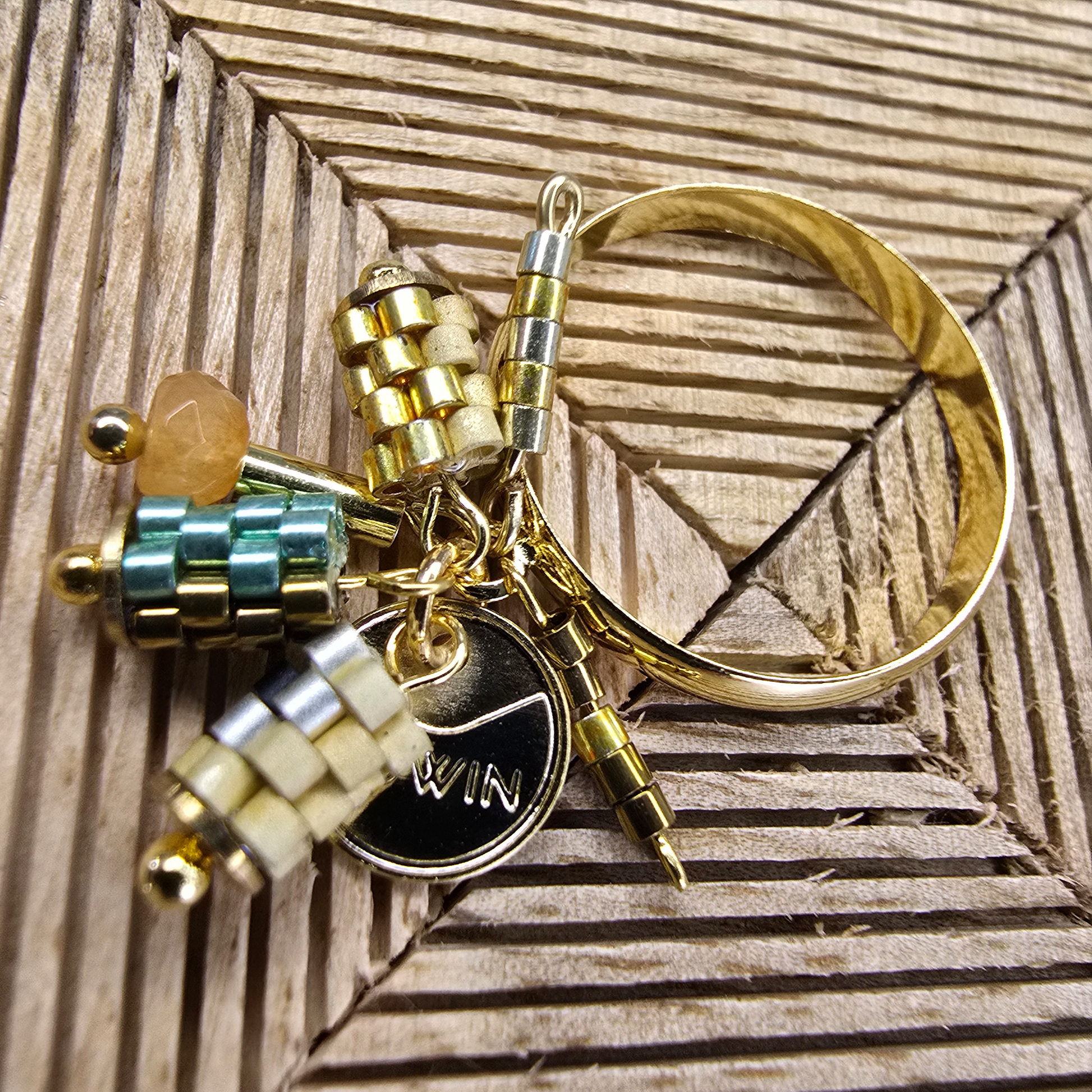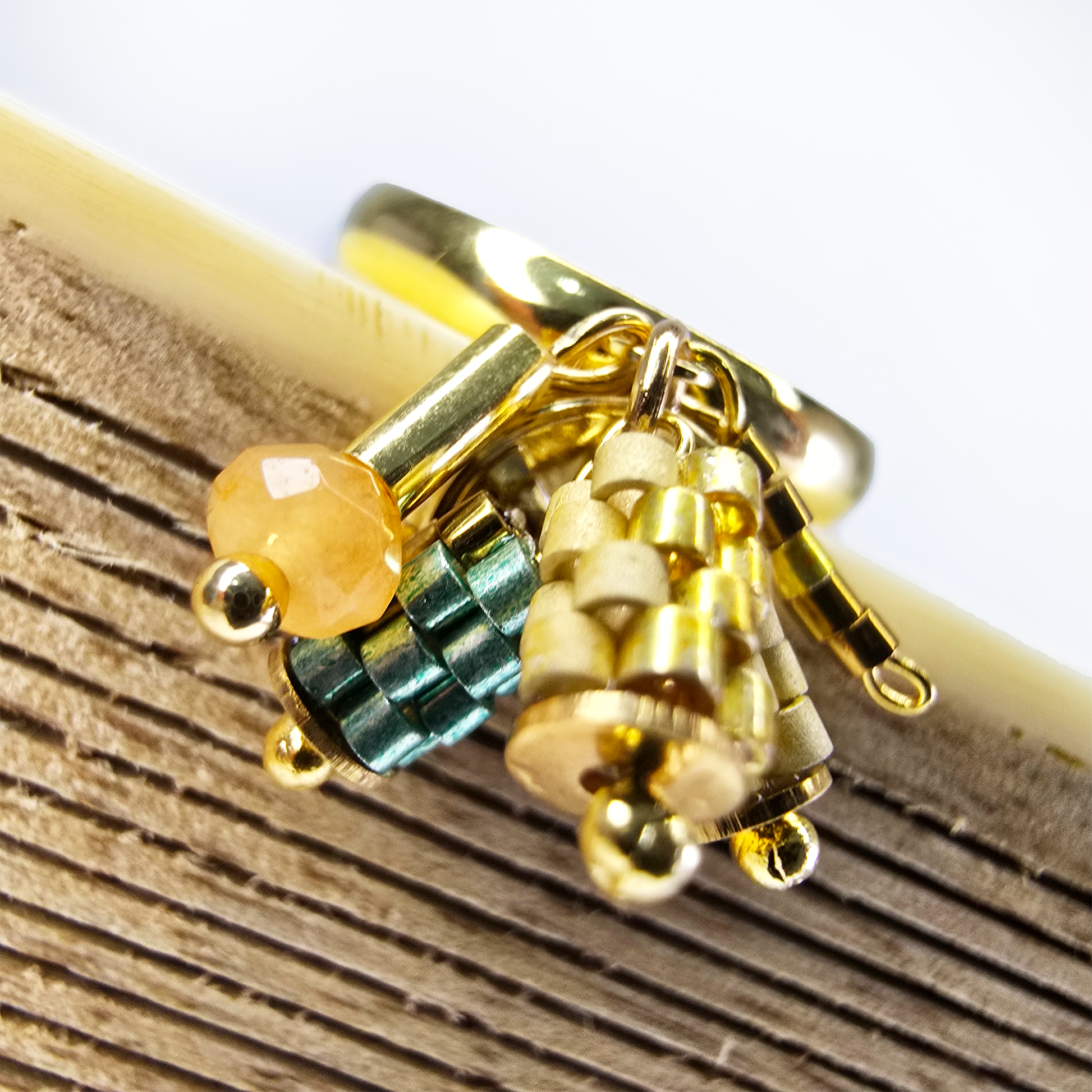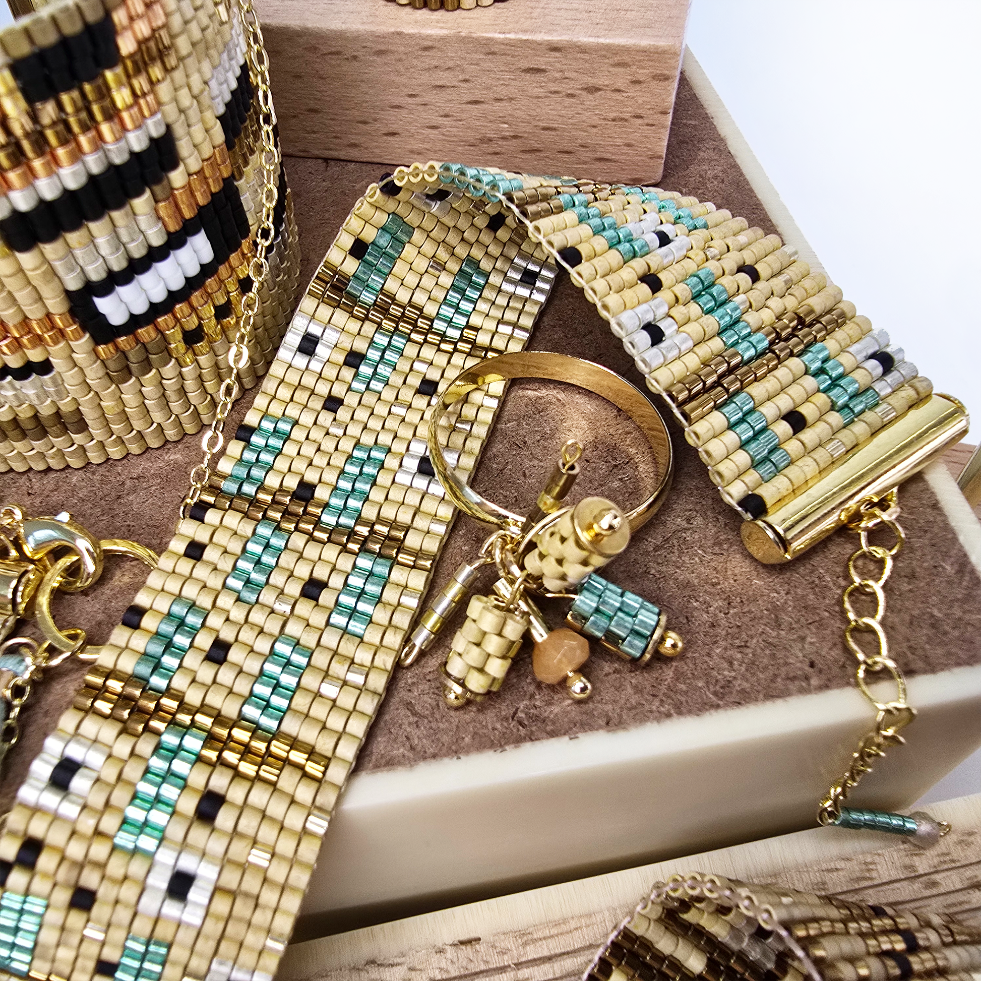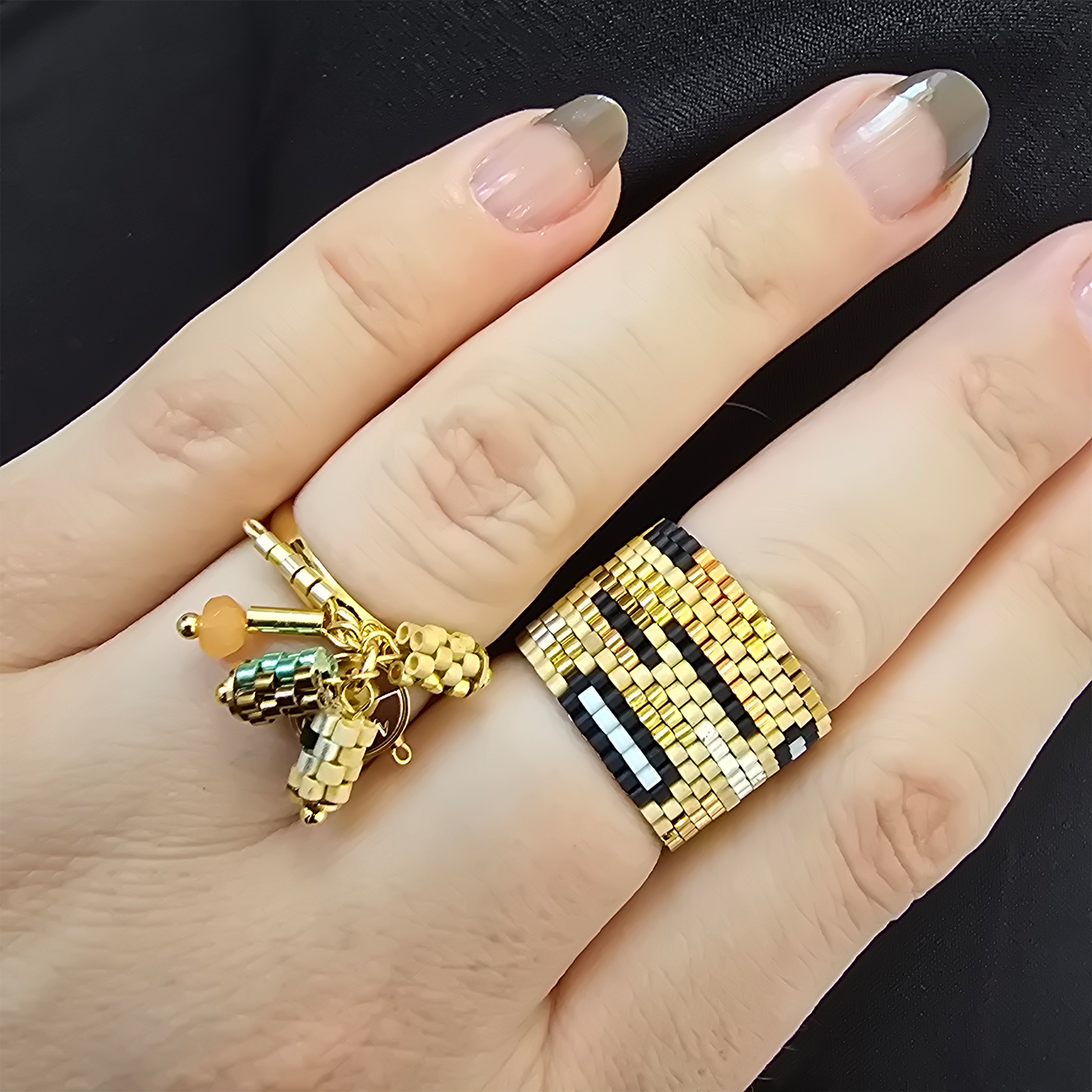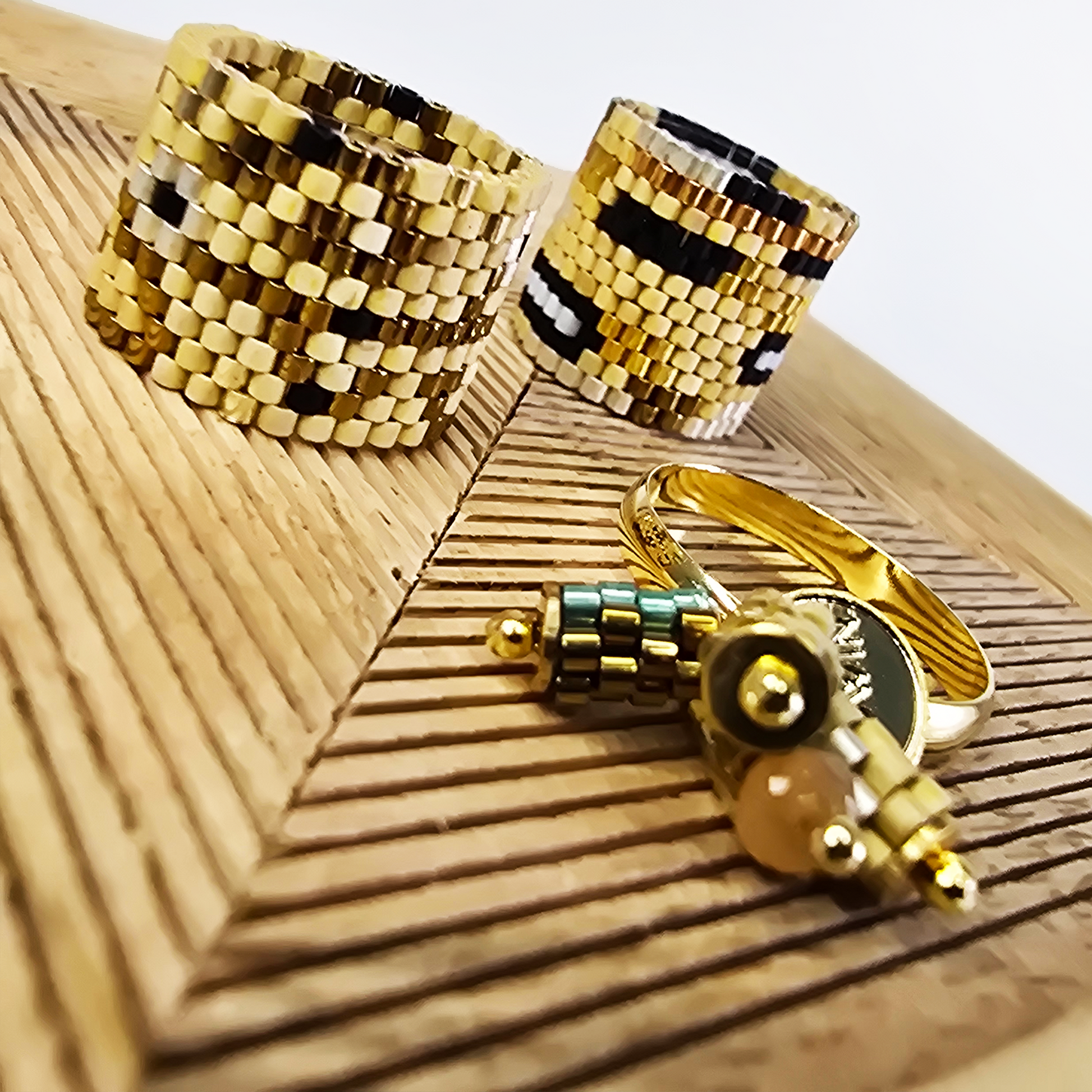 Simplicity and majesty in a single piece. The Solenne ring is a tribute to timeless beauty, inspired by Klimt's golden shapes and textures. Handmade with Miyuki beads and 18k gold-plated details, it is a symbol of subtle sophistication.