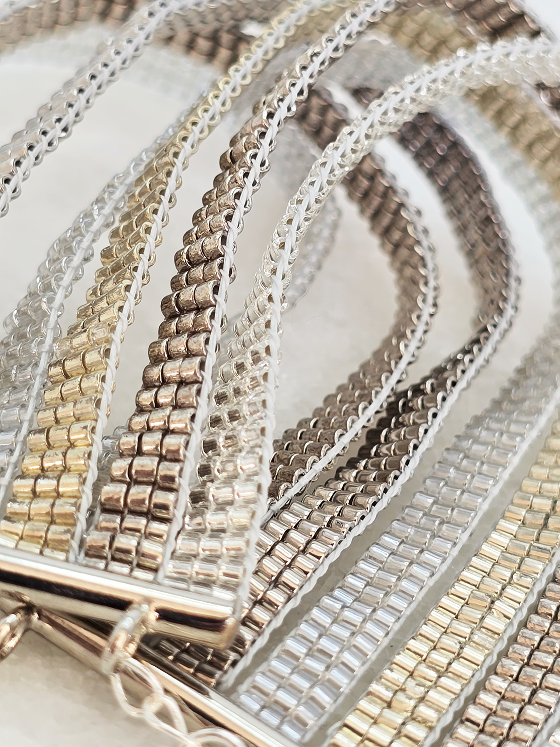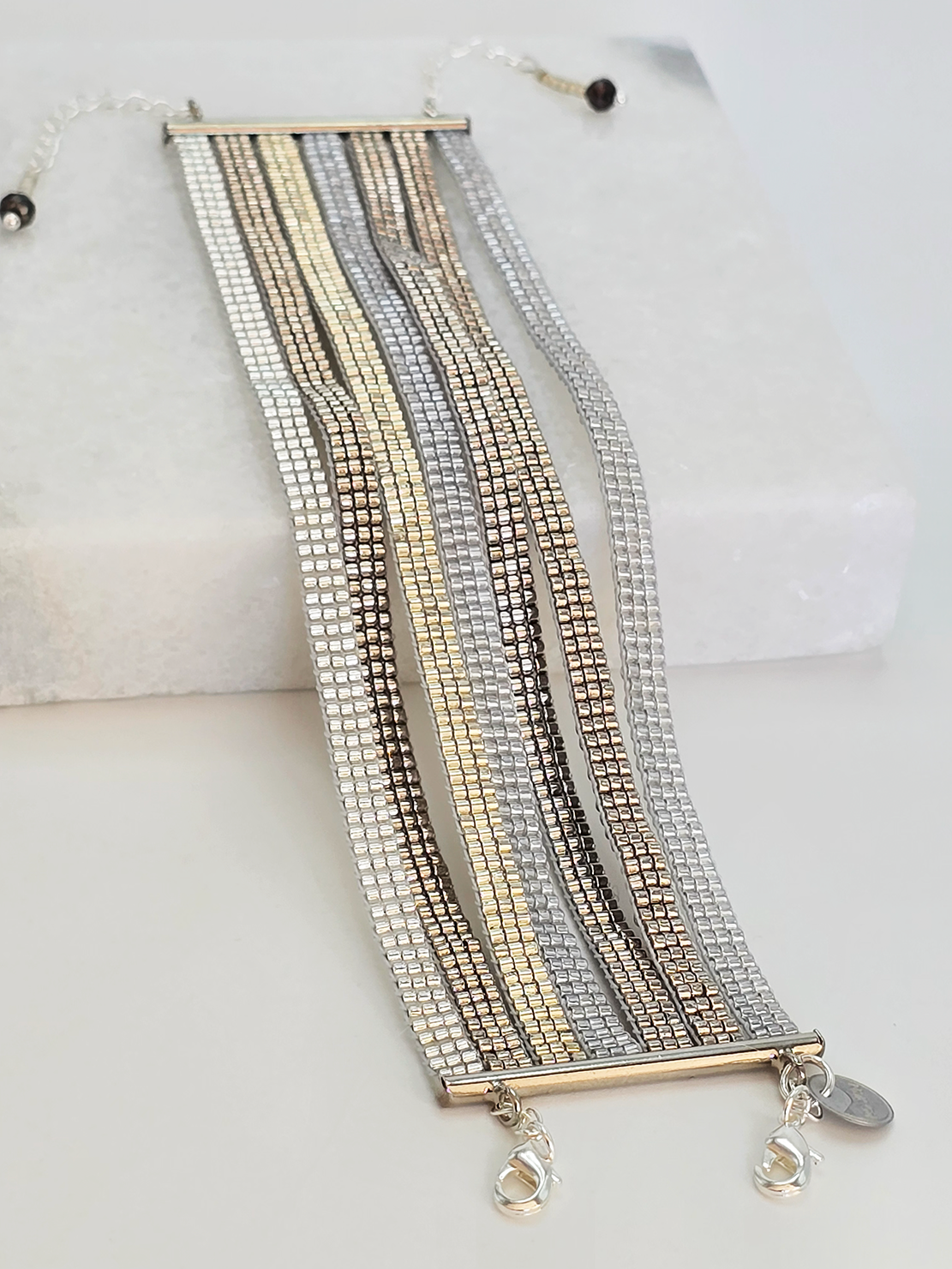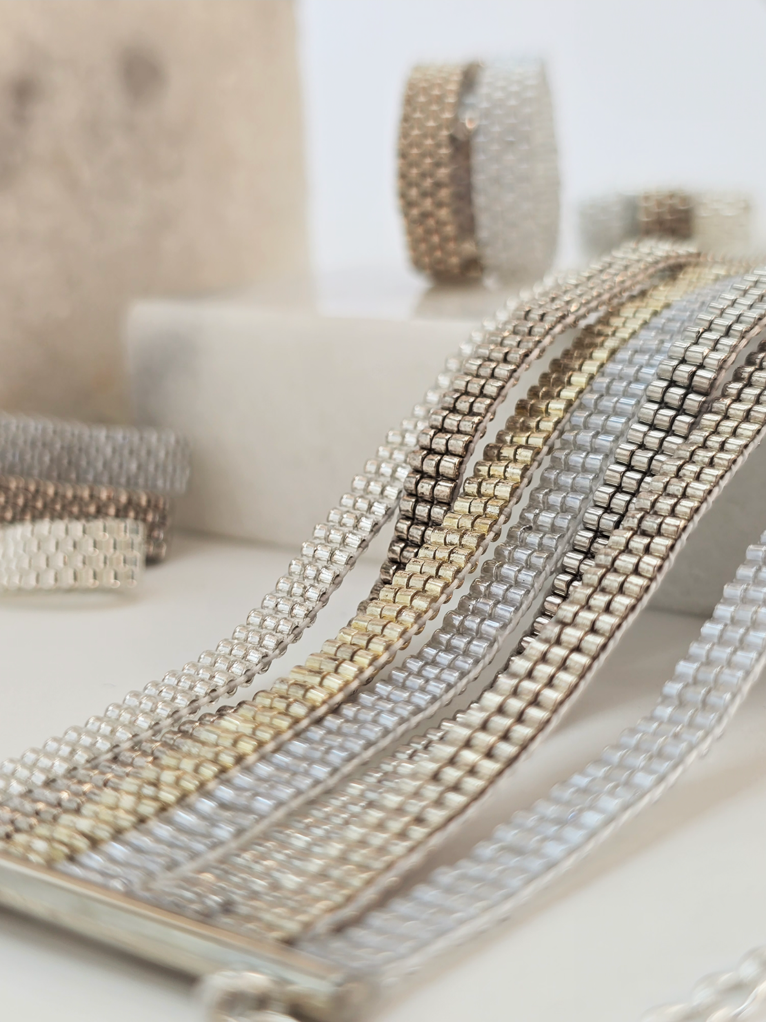 A pulseira Mercúrio é uma peça de design contemporâneo que combina força e sofisticação. Confeccionada à mão com delicadas miçangas Miyuki em tons prateados e grafite, cria um efeito metálico elegante que evoca o movimento fluido do mercúrio.