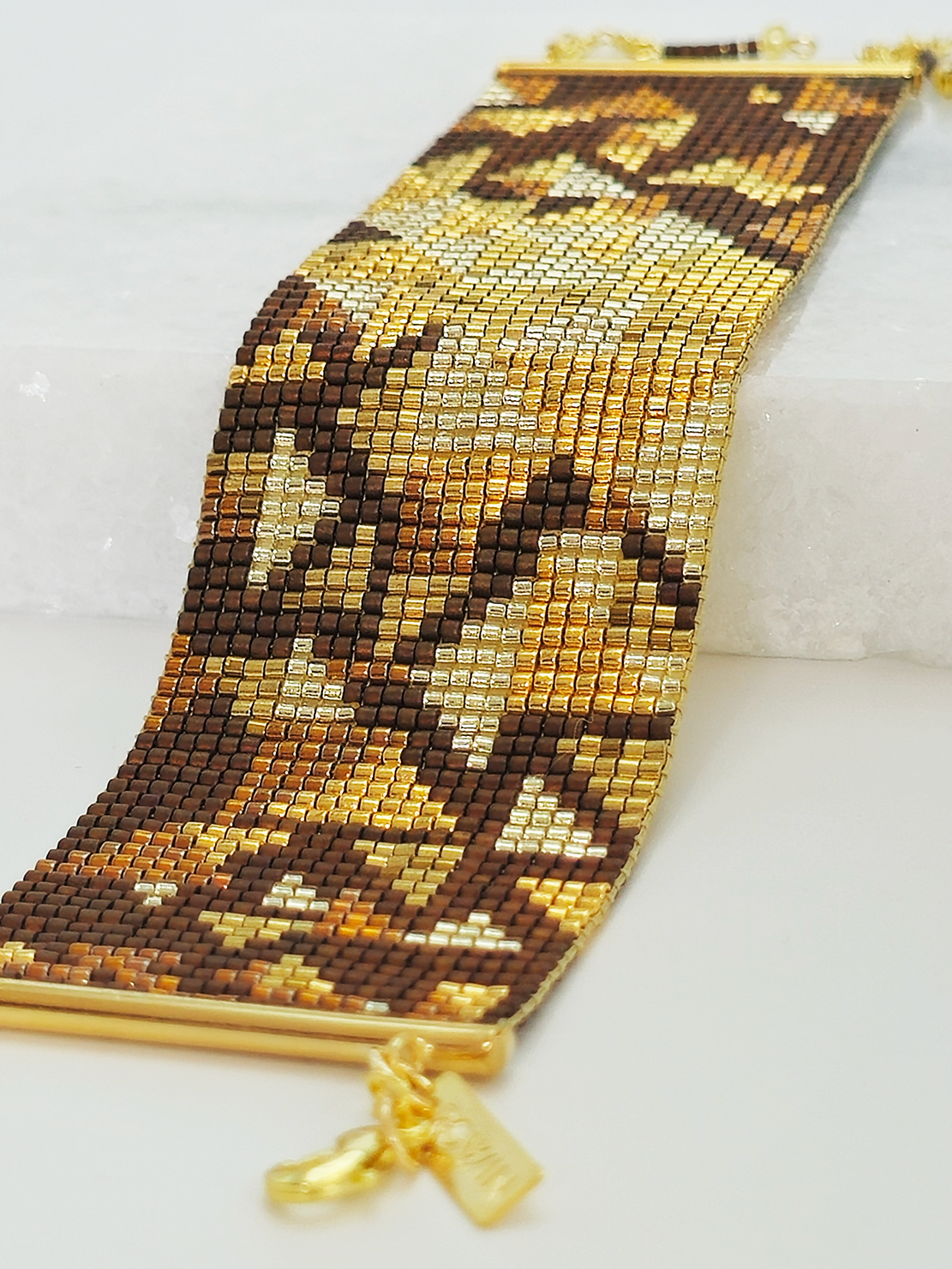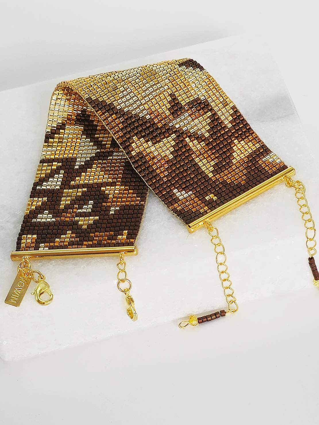 Uma peça imponente e sofisticada, feita à mão com miçangas Miyuki em tons de marrom, dourado e champagne, que criam um desenho rico em detalhes e brilho. Finalizada com fechos folheados a ouro 18k, é a escolha perfeita para quem busca elegância com personalidade.